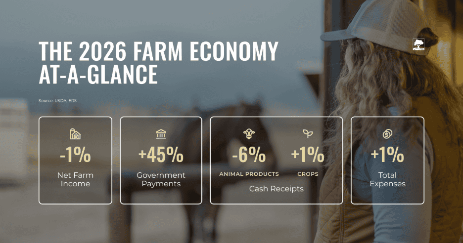 Bottom line: Net farm income is projected to dip slightly in 2026 after a 21 percent increase in 2025. Animal cash receipts are forecasted to drop after a stronger year in 2025, while crop receipts are expected to remain moderately stable. Despite $44.3B in government farm payments forecasted to comprise nearly 30 percent of total net income, a restricted credit environment persists.
